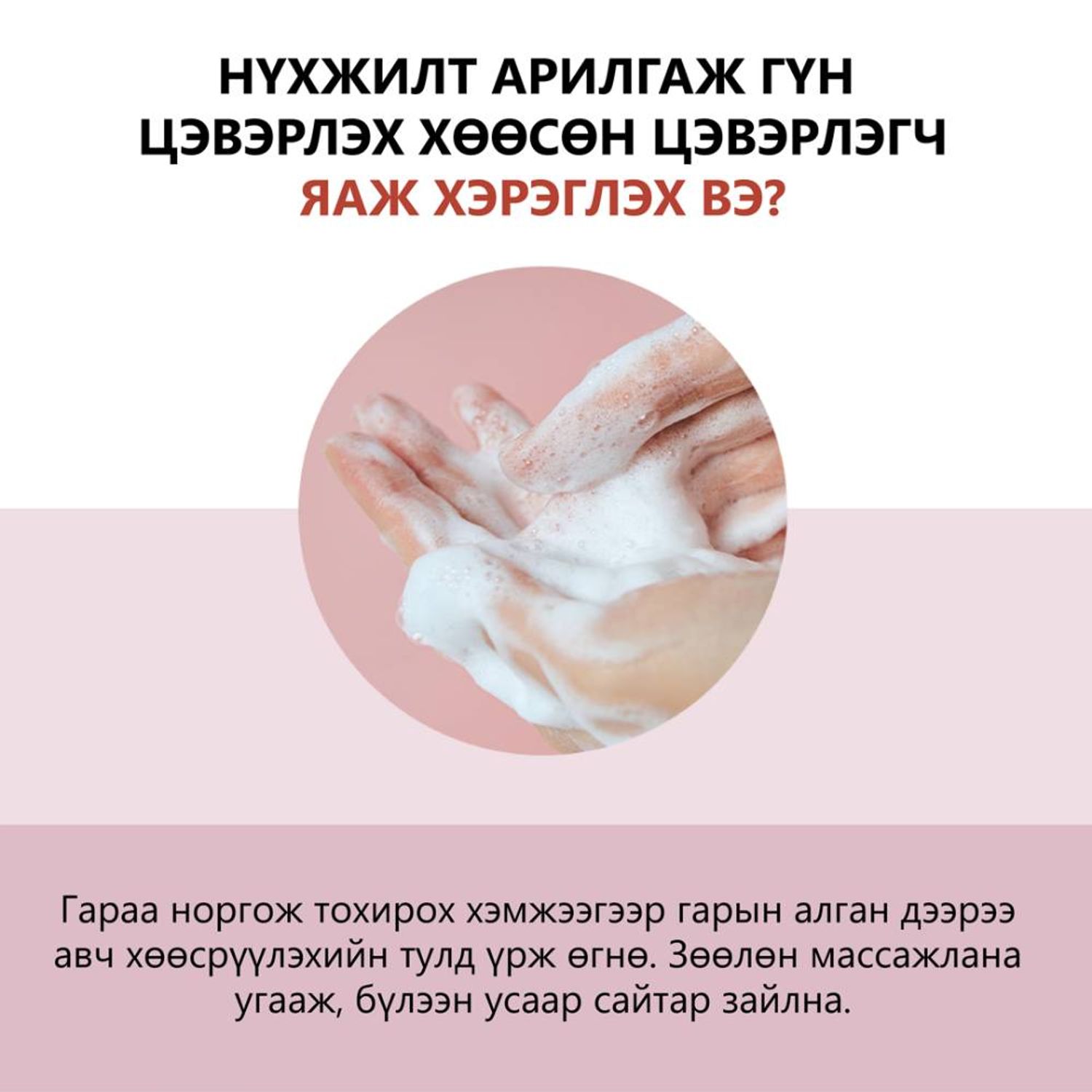 Чийглэг гарандаа тохирох хэмжээгээр авч, устай холин сайтар хөөсрүүлсний дараа нүүрэндээ массажлан иллэг хийх байдлаар угаана.Сайн массажилж угаасны дараа усаар угааж, нүүрээ алчуур, зохих салфетикаар зөөлөн товшиж хатаагаарай.